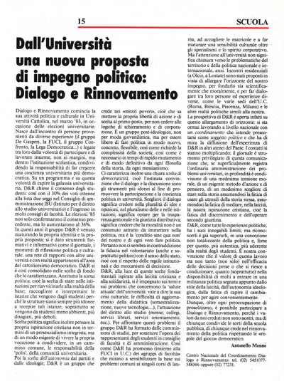 Dialogo e Rinnovamento comincia la sua attività politica e culturale in Università Cattolica, nel marzo '83, in occasione delle elezioni universitarie. Nasce dall'incontro di persone provenienti da diverse esperienze (il gruppo De Gasperi, la FUCI, il gruppo Confronto, la Lega Democratica...) e legate tra loro dalla volontà di partecipare e di lavorare insieme, non ai margini, ma dentro l'istituzione scolastica, condividendo la responsabilità di far crescere una coscienza universitaria più democratica. Su un programma e su questa volontà di capire la galassia universitaria, D&R chiese il consenso degli studenti: così con il 30% dei voti ottenne alla lista due seggi nel Consiglio di amministrazione ISU (Istituto per il diritto allo studio universitario) e l'ingresso in molti consigli di facoltà. Le elezioni '85 non solo confermarono il consenso precedente, ma lo aumentarono al 36%. In questi anni il gruppo D&R è venuto maturando la propria identità e la propria proposta; si è dato strumenti formativi e informativi come il giornale, i momenti di riflessione politica e culturale, una rete di rapporti con altre università e con realtà appartenenti all'area del cattolicesimo democratico. D&R si è così consolidato nelle scelte di fondo che lo caratterizzano. Anzitutto la scena politica, cioè la scelta di stare nelle istituzioni per riavvicinarle alla realtà della base; raccogliere e interpretare le istanze che vengono dagli studenti perché le strutture siano sempre più idonee a recepire tali istanze, soprattutto se vengono da studenti meno abbienti, più disagiati, più deboli.