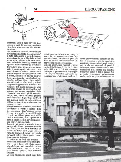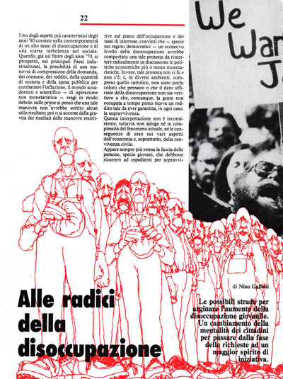 Ma sono anche mutate le caratteristiche strutturali della nostra disoccupazione? Il fatto è che, come si sa, la disoccupazione riguarda, sia al Nord che al Sud, soprattutto i giovani e le fasce cosiddette deboli del mercato; mentre non riguarda eccessivamente gli adulti del Nord dove, anzi, se sommiamo occupati e cassintegrati, otteniamo una quasi piena occupazione. La condizione giovanile appare, dunque, grave in tutto il Paese, anche se in misure diverse; finisce per riguardare pure le classi medio-alte (sebbene finora siario esistiti svariati modi per alleviare i problemi dei giovani appartenenti alle classi privilegiate). Per quanto riguarda gli ultra trentenni, invece, la governabilità del sistema non appare minacciata dalla disoccupazione degli adulti meridionali; e, anzi, risulta rafforzata proprio dalle circostanze di privilegio del Nord che, qui sta il punto, hà molta più forza politica – si pensi anche ai «mass media» – del Sud.