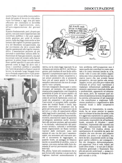 Esistono, ancora, leggi regionali – come quella della Regione Lazio del 22 febbraio 1985 – ed il D.L. del 24 ottobre 1985 «per la promozione e lo sviluppo della imprenditorialità giovanile nel Mezzogiorno». L'intenzione evidente di questi provvedimenti consiste nel tentare di stimolare le attività produttive gestite direttamente dai giovani, in alternativa alla loro domanda di posti di lavoro che, specie nella Pubblica Amministrazione, non sembra più posi,ibile sviluppare come in tempi passati. Ciò potrebbe determinare un'importante svolta, anche sul piano del costume, nel nostro Paese: invece della ricerca individuale del posto di lavoro (a volte attraverso l'avvilente e, oggi, non più tanto efficiente iter clientelare) si dovrebbe passare alla organizzazione, anzi, all'auto-organizzazione dei giovani stessi.