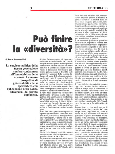 È certo difficile e improbabile pensare oggi che l'attuale partito comunista riesca in tempi brevi a modificare se stesso. Però se è vero, come è vero, che all'interno del PCI è in corso un dibattito serrato su come e perché cambiare, può essere un elemento non trascurabile per condizionarne l'andamento, il sapere che fuori, anche nella DC, c'è qualcuno che aspetta la fine della «diversità».