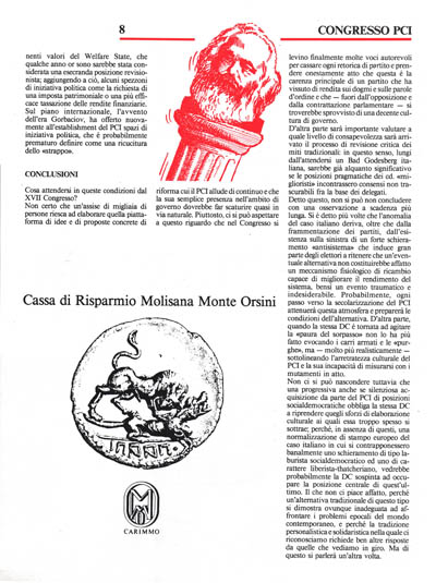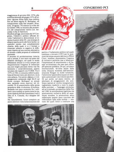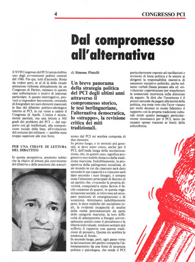 Non ci si può nascondere tuttavia che una progressiva anche se silenziosa acquisizione da parte del PCI di posizioni socialdemocratiche obbliga la stessa DC a riprendere quegli sforzi di elaborazione culturale ai quali essa troppo spesso si sottrae; perché, in assenza di questi, una normalizzazione di stampo europeo del caso italiano in cui si contrapponessero banalmente uno schieramento di tipo laburista socialdemocratico ed uno di carattere liberista-thatcheriano, vedrebbe probabilmente la DC sospinta ad occupare la posizione centrale di quest'ultimo. Il che non ci piace affatto, perché un'alternativa tradizionale di questo tipo si dimostra ovunque inadeguata ad affrontare i problemi epocali del mondo contemporaneo, e perché la tradizione personalistica e solidaristica nella quale ci riconosciamo richiede ben altre risposte da quelle che vediamo in giro. Ma di questo si parlerà un'altra volta.