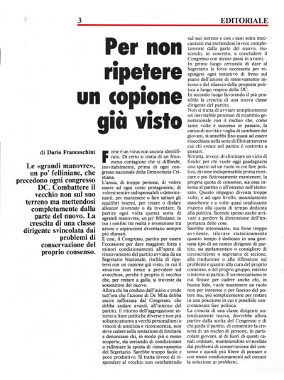 Allora chi ha creduto dall'inizio e crede tutt'ora che l'azione di De Mita debba uscire rafforzata dal Congresso, che debba andare avanti, all'interno del partito, il ritorno dell'aggregazione attorno a linee politiche diverse e non più soltanto attorno a vecchi personalismi o vincoli di amicizia e riconoscenza, non deve cadere nella tentazione di limitarsi a denunciare chi, in modo più o meno scoperto, sta cercando di condizionare o rallentare la spinta di rinnovamento del Segretario. Sarebbe troppo facile e poco produttivo. Si tratta invece di rispondere al vecchio non combattendo sul suo terreno e con 1 suoi soliti meccanismi ma mettendosi invece completamente dalla parte del nuovo, riuscendo, in concreto, a concludere il Congresso con alcuni passi in avanti. In primo luogo cercando di dare al Segretario la forza necessaria per respingere ogni tentativo di freno sul piano dell'azione di rinnovamento interno e del rilancio della proposta politica a lungo respiro della DC.