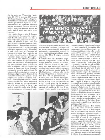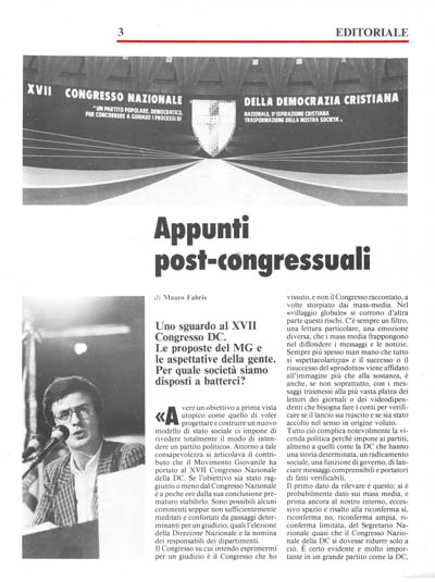 Avere un obiettivo a prima vista utopico come quello di voler progettare e costruire un nuovo modello di stato sociale ci impone di rivedere totalmente il modo di intendere un partito politico». Attorno a tale consapevolezza si articolava il contributo che il Movimento Giovanile ha portato al XVII Congresso Nazionale della DC. Se l'obiettivo sia stato raggiunto o meno dal Congresso Nazionale è a poche ore dalla sua conclusione prematuro stabilirlo. Sono possibili alcuni commenti seppur non sufficientemente meditati e confortati da passaggi determinanti per un giudizio, quali l'elezione della Direzione Nazionale e la nomina dei responsabili dei dipartimenti.