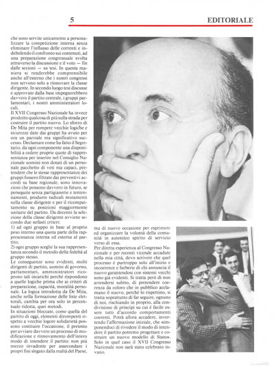 Il XVII Congresso Nazionale ha invece prodotto qualcosa di più sulla strada per costruire il partito nuovo. Lo sforzo di De Mita per rompere vecchie logicbe e sicurezz date dai gruppi ha avuto per ora un parziale ma significativo successo. Declamare come ha fatto il Segretario, da ogni componente una disponibilità a cedere proprie quote di rappresentanza per inserire nel Consiglio Nazionale uomini non dotati di un personale pacchetto di voti ma capaci, pretendere che le stesse rappresentanze dei gruppi fossero filtrate dai preventivi accordi su base regionale, sono innovazioni che possono davvero in futuro, se perseguite senza partigianerie e tentennamenti, produrre radicali mutamenti nella classe dirigente e per il ricompattamento su posizioni maggiormente unitarie del partito. Da decenni la selezione della classe dirigente avviene secondo due nefasti criteri: