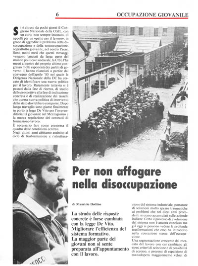 Si è chiuso da pochi giorni il Congresso Nazionale della CGIL, con un coro, non sempre intonato, di appelli per un «patto per il lavoro», in grado di aggredire il problema della disoccupazione e della sottoccupazione, soprattutto giovanile, nel nostro Paese. 'Sono molti mesi che questi messaggi vengono lanciati da larga parte del mondo politico e sindacale, la CISL l'ha messi al centro del proprio ultimo congresso molti esponenti dei partiti di governo li hanno rilanciati a partire dal convegno dell'aprile '85 nel quale la Dirigenza Nazionale della DC ha cercato di identificare una nuova politica per il lavoro. Raramente tuttavia si è passati dalla fase di ricerca, di studio delle prospettive alla fase di indicazione concreta e di realizzazione dei tasselli che questa nuova politica di intervento dello stato dovrebbero comporre. Dopo lungo travaglio sono giunte finalmente in porto la legge De Vito per l'imprenditorialità giovanile nel Mezzogiorno e la nuova regolazione dei contratti di formazione-lavoro.