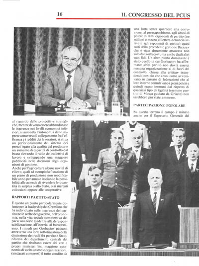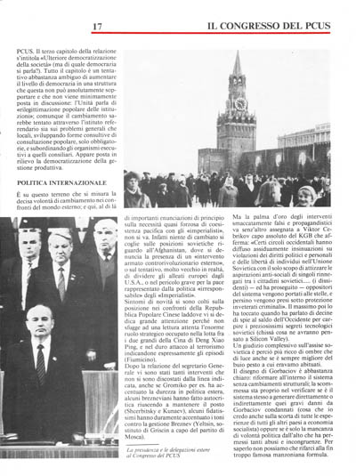 Su questo terreno il campo è minato anche per il Segretario Generale del PCUS. Il terzo capitolo della relazione s'intitola «Ulteriore democratizzazione della società» (ma di quale democrazia si parla?). Tutto il capitolo è un tentativo abbastanza ambiguo di aumentare il livello di democrazia in una struttura che questa non può assolutamente sopportare e che non viene minimamente posta in discussione: l'Unità parla di «rilegittimazione popolare delle istituzioni»; comunque il cambiamento sarebbe tentato attraverso l'istituto referendario sia sui problemi generali che locali, sviluppando forme consultive di consultazione popolare, solo obbligatorie, e subordinando gli organismi esecutivi a quelli consiliari. Appare posta in rilievo la democratizzazione della gestione produttiva.
