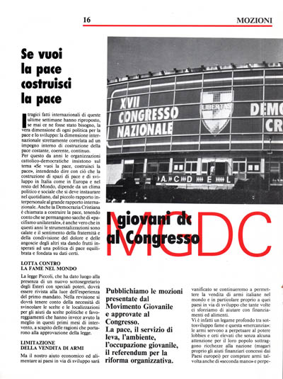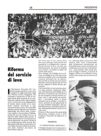 M.G. DC di Reggio Emilia, proponga l'obiezione di coscienza come un diritto soggettivo e non come una concessione, in conformità con la sentenza della Corte Costituzionale (24 maggio 1985) per cui il sacro dovere di difesa della Patria è espletato in più forme, tra cui anche il servizio civile. Per tutti questi motivi, sinteticamente presentati qui sopra, il Movimento Giovanile della Democrazia Cristiana invita il XVII Congresso Nazionale ad approvare la seguente