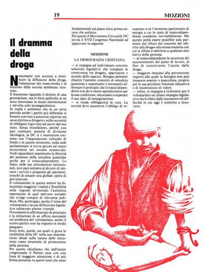 «non diritto» a drogarsi e sulla necessità di obbligare il giovane ad uscire dal suo stato. Senza trionfalismi, perché non può costituire materia di divisione ideologica, la DC si è mantenuta coerente con l'impostazione culturale di fondo e in questo momento, nella sede parlamentare si trova ancora ad essere minoritaria nei «nodi» sostanziali. Nodi riguardanti soprattutto la illeceità del possesso della «modica quantità» anche per il tossicodipendente. Lo Stato, nelle sue articolazioni istituzionali, non può sottrarsi al dovere di istituire i servizi e preparare gli operatori, noncp.é di attuare una globale opera di prevenzione.