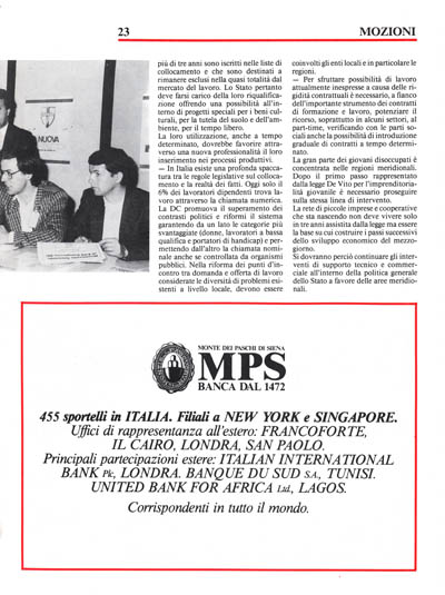 Il consolidamento dei segnali d'uscita dal periodo buio della crisi a livello nazionale, la graduale discesa dell'inflazione e la stabilità monetaria, in un panorama internazionale mutato, sono risultati importanti. Noi giovani DC crediamo che, al di là delle dichiarazioni di principio, nei fatti della vita politica, il problema della disoccupazione giovanile debba divenire prioritario per il paese, per istituzioni, partiti, parti sociali ed economiche.