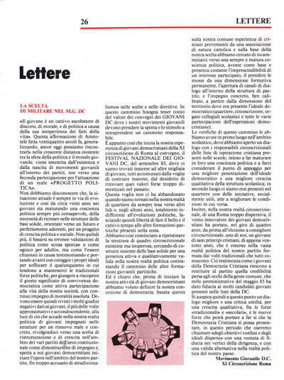 Inoltre, nella nostra realtà circoscrizionale, di una Roma troppo dispersiva, il vento innovatore dei giovani democristiani ha portato, nel giro di quattro anni, da prima all'elezione a consigliere circoscrizionale, uno di noi, un giovane di sani principi cristiani, di appena ventotto anni, che è emerso nella vasta realtà politica del nostro partito formata dai volti tradizionali che tutti conoscono. Ciò testimonia come i giovani della Democrazia Cristiana riescono a restituire al partito quella credibilità persa agli occhi della gente comune, che nelle amministrative del maggio 85 ha dato fiducia ai molti candidati giovani presenti nelle liste della DC.