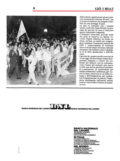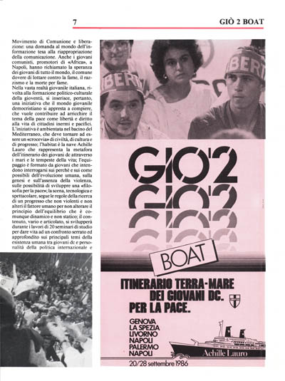 I giovani del GIO' 2 Boat sono pertanto impegnati a dimostrare che è falso credere di essere arrivati troppo tardi, in un mondo troppo vecchio, con equilibri ormai consolidati, dove tutto sarebbe già stato deciso e dove non ci sarebbe più niente da fare in favore dell'afferma ione d una cultura di pace: i giovam dc s1 sono dati appuntamento sull'Achille Lauro, per solcare «pacificamente» le acque agitate del Mediterraneo, perché si sentono destinatari della millenaria esperienza cristiana che considera essenziale edificare 1 pace attraverso il dialogo rispettoso di tutte le identità ed in particolare del diritto di ogni uomo ad una esiste a di dignità e di libertà e intendono scrivere una storia di pa'ce nel mare più conteso ed agitato d'Europa: non si tratta di una fantastica utopia, i fatti dimostreranno ancora una volta che l'utopia diviene realtà quando si è in tanti a credere nella stessa cosa, e noi, giovani dc abbiamo dimostrato di crederci, in que ta «cosa» e di essere considerevolmente tanti ad amare soprattutto la pace e di promuoverla non con la lotta ma con i metodi di pace.