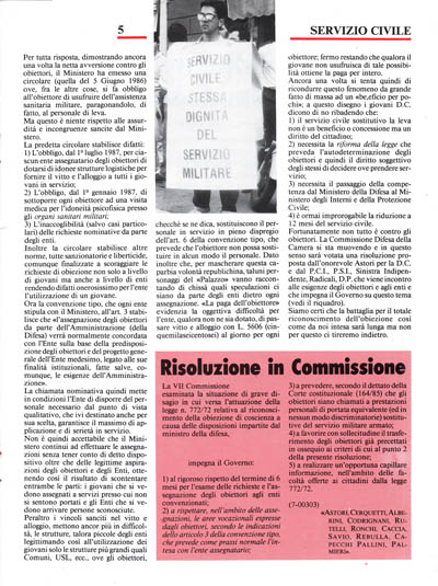 - è ormai improrogabile la riduzione a 12 mesi del servizio civile. Fortunatamente non tutto è contro gli obiettori. La Commissione Difesa della Camera si sta muovendo e in questo senso sarà votata una risoluzione proposta dall'onorevole Astori per la D.C. e dal P.C.I., P.S.I., Sinistra Indipendente, Radicali, D.P. che viene incontro alle esigenze degli obiettori e agli enti e che impegna il Governo su questo tema (vedi il riquadro).