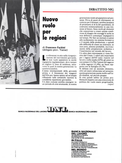 L'anno internazionale della gioventù prima e il fenomeno dei «ragazzi dell'85» poi, hanno spinto ad un'ampia riflessione sulle tematiche inerenti la cosiddetta «questione giovanile».