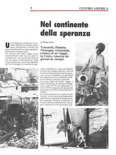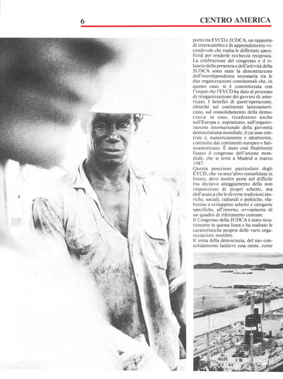La nostra presenza non è stato un atto formale, ma ha inciso profondamente, specialmente nella fase di preparazione del congresso. Durante le giornate di Caracas abbiamo direttamente constatato l'esistenza di un particolare rapporto tra EYCD e JUDCA, un rapporto di interscambio e di apprendimento vicendevole che esalta le differenti specificità per renderle ricchezza reciproca. La celebrazione del congresso e il rilancio della presenza e dell'attività della JUDCA sono state la dimostrazione dell'interdipendenza necessaria tra le due organizzazioni continentali che, in questo caso, si è concretizzata con l'imput che l'EYCD ha dato al processo di riorganizzazione dei giovani dc americani. I benefici di quest'operazione, oltreché sul continente latinoamericano, sul consolidamento della democrazia in esso, ricadranno anche sull'Europa e, soprattutto, sull'organizzazione internazionale della gioventù democristiana mondiale, il cui asse centrale è, numericamente e idealmente, costituito dai continenti europeo e latinoamericano. È stato così finalmente fissato il congresso dell'unione mondiale, che si terrà a Madrid a marzo 1987.