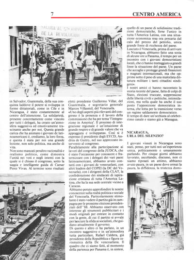 Parallelamente alla partecipazione ai lavori del congresso della JUDCA, che è stato l'occasione per conoscere e fraternizzare con i delegati dei vari paesi latinoamericani, abbiamo avuto contatti con i giovani dc venezuelani, con altri leaders del COPEI (la DC del Venezuela), con i'dirigenti della CLAT, la confederazione dei sindacati di ispirazione cristiana di tutta l'America Latina, che ha la sua sede centrale vicino a Caracas.