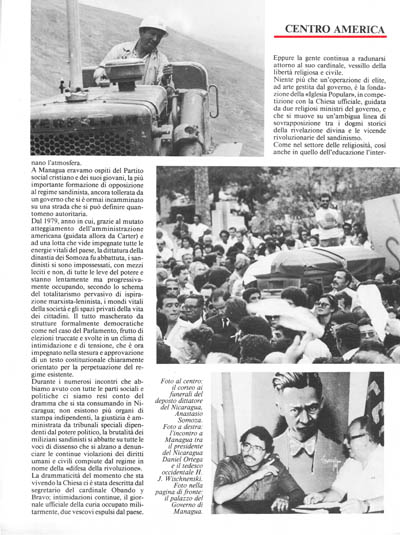 Durante i numerosi incontri che abbiamo avuto con tutte le parti sociali e politiche ci siamo resi conto del dramma che si sta consumando in Nicaragua; non esistono più organi di stampa indipendenti, la giustizia è amministrata da tribunali speciali dipendenti dal potere politico, la brutalità dei miliziani sandinisti si abbatte su tutte le voci di dissenso che si alzano a denunciare le continue violazioni dei diritti umani e civili compiute dal regime in nome della «difesa della rivoluzione». La drammaticità del momento che sta vivendo la Chiesa ci è stata descritta dal segretario del cardinale Obando y Bravo; intimidazioni continue, il giornale ufficiale della curia occupato militarmente, due vescovi espulsi dal paese.