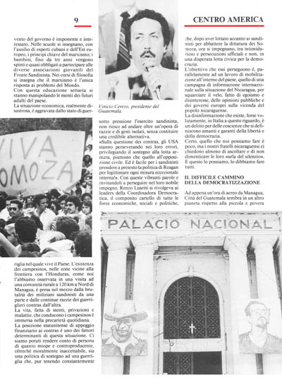 «Sulla questione dei contras, gli USA stanno perseverando nei loro errori, privilegiando il sostegno alla lotta armata, piuttosto che quello all'opposizione civile. Ed è facile per i sandinisti prendere a pretesto la politica di Reagan per legittimare ogni misura eccezionale interna!». Con queste vibranti parole e invitandoli a perseguire nel loro nobile impegno, Renzo Lusetti si rivolgeva ai leaders della Coordinadora Democratica, il composito cartello di tutte le forze economiche, sociali e politiche, che, dopo aver lottato accanto ai sandinisti per abbattere la dittatura dei Somoza, ora si impegnano, tra intimidalioni e persecuzioni ufficiali e non, in una disperata lotta civica per la democrazia.