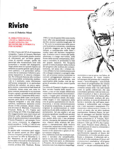 Il 1986 è l'anno del 500 di «Umanesimo integrale», l'opera di Jacques Maritain che costituì il principale quadro teorico di riferimento per un'intera generazione di cattolici europei, quella che partecipò alla ricostru)ione (non solo economica e sociale) del dopoguerra. Negli ultimi mesi si è quindi riaperto un dibattito su questa grande opera di pensiero politico, e in particolare sull'assunto che ne costituisce l'obiettivo-proposta riassuntivo: la «nuova cristianità». Per il filosofo francese alla vecchia e non resuscitabile «cristianità» medioevale si è sostituito, come riferimento dell'azione temporale (e in particolare politica) dei cattolici, un nuovo «progetto storico concreto» (si badi bene) di cristianità, intesa come «un certo regime comune temporale le cui strutture recano, a gradi e secondo modi del resto molto variabili, l'impronta della concezione cristiana della vita»; con la precisazione, però, che se c'è «una sola verità religiosa integrale» e una sola chiesa cattolica, nondimeno «possono aversi alcune civiltà cristiane, alcune cristianità diverse» (J. Maritain, Umanesimo Integrale, Boria, p. 171; l'opera uscì però a Parigi nel 1936). Uno degli autori che maggiormente sono intervenuti nel dibattito sulla riproponibilità 50 anni dopo di queste posizioni è senza dubbio Vittorio Possenti (v. ad esempio Verso una nuova cristianità, in «Aggiornamenti sociali» n. 7-8/86, e L'idea di una cristianità nuova, in «la Discussione» n. 19/86).