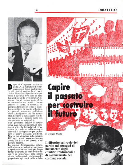 La sinistra democristiana infatti, nelle diverse articolazioni «sociale» e «politica» ha costruito per lungo tempo un punto di riferimento decisivo ed importante nella nostra storia, dagli anni del centrismo degasperiano agli anni della solidarietà nazionale. Molti l'hanno definita la coscienza critica del partito ed il punto di raccordo più significativo e qualificato con aree elettorali strategiche, cioè con realtà sociali interessate dalla competizione con i partiti storici della sinistra e con le componenti della società, specialmente giovanili, più attente ai processi di mutamento degli equilibri tradizionali e di cambiamento del costume sociale. I meriti storici, non storicizzati, della sinistra DC non sono difficili da individuare: basta voltar le spalle all'indietro e rendersi conto dell'apporto qualitativo e prospettico che l'intera Democrazia Cristiana ne ha acquisito.