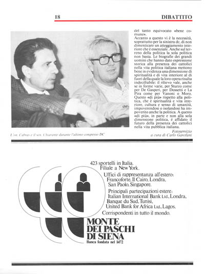Accanto a questo vi è la necessità, soprattutto per la sinistra dc, di non dimenticare un atteggiamento interiore che è essenziale. Anche sul terreno della politica la sola politica non basta. Le biografie dei grandi uomini che hanno dato espressione storica alla presenza dei cattolici nella vita politica italiana mettono bene in evidenza una dimensione di spiritualità e di vita interiore al di fuori della quale la loro opera risulta indecifrabile: il rilievo vale, anche se in forme varie, per Sturzo come per De Gasperi, per Dossetti e La Pira come per Vanoni o Moro. Questo «di più» rispetto alla politica, che è spiritualità e vita interiore, cultura e senso di umanità, impoverendosi o isolandosi ha impoverito anche la politica. A questo «di più», in parte e non alla sola dimensione politica, è affidato il futuro della presenza dei cattolici nella vita pubblica italiana.