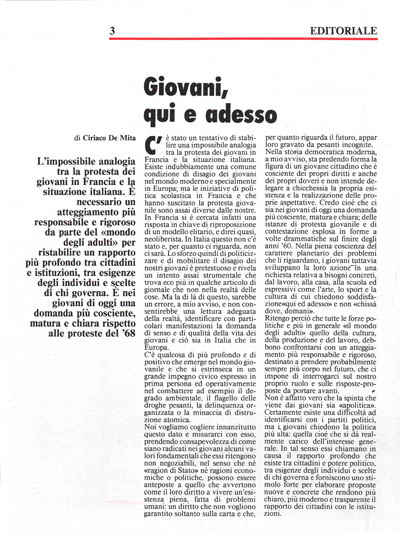 C'è stato un tentativo di stabilire una impossibile analogia tra la protesta dei giovani in Francia e la situazione italiana. Esiste indubbiamente una comune condizione di disagio dei giovani nel mondo moderno e specialmente in Europa; ma le iniziative di politica scolastica in Francia e che hanno suscitato la protesta giovanile sono assai diverse dalle nostre. In Francia si è cercata infatti una risposta in chiave di riproposizione di un modello elitario, e direi quasi, neoliberista. In Italia questo non c'è stato e, per quanto ci riguarda, non ci sarà. Lo sforzo quindi di politicizzare e di mobilitare il disagio dei nostri giovani è pretestuoso e rivela un intento assai strumentale che trova eco più in qualche articolo di giornale che non nella realtà delle cose. Ma la di là di questo, sarebbe un errore, a mio avviso, e non consentirebbe una lettura adeguata della realtà, identificare con particolari manifestazioni la domanda di senso e di qualità della vita dei giovani e ciò sia in Italia che in Europa.