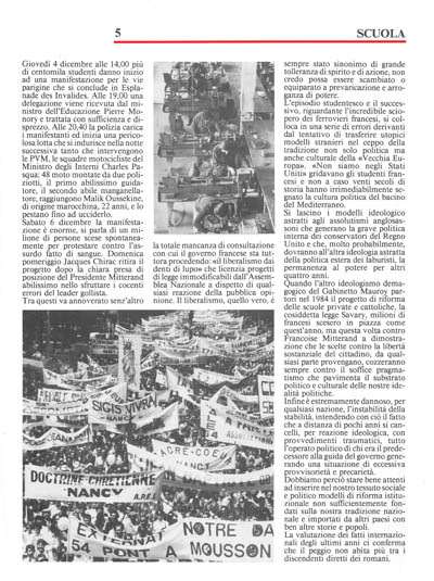 Quando l'altro ideologismo demagogico del Gabinetto Mauroy partorì nel 1984 il progetto di riforma delle scuole private e cattoliche, la cosiddetta legge Savary, milioni di francesi scesero in piazza come quest'anno, ma questa volta contro Francoise Mitterand a dimostrazione che le scelte contro la libertà sostanziale del cittadino, da qualsiasi parte provengano, cozzeranno sempre contro il soffice pragmatismo che pavimenta il substrato politico e culturale delle nostre idealità politiche.