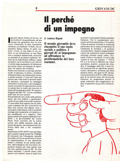 Il significato vero delle candidature di giovani esponenti del Movimento Giovanile nelle liste della DC ha questo esatto significato, questo valore, questo impegno. Un servizio perché il partito rappresenti veramente la società in movimento, in evoluzione, una lettura della DC che cerca il suo difficile rinnovamento anche in termini culturali.