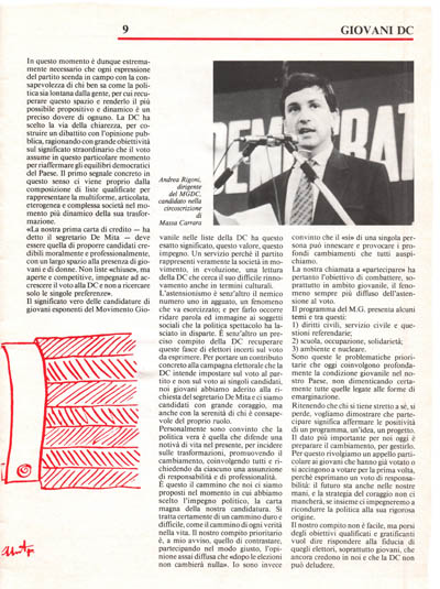 L'astensionismo è senz'altro il nemico numero uno in agguato, un fenomeno che va esorcizzato; e per farlo occorre ridare parola ed immagine ai soggetti sociali che la politica spettacolo ha lasciato in disparte. È senz'altro un preciso compito della DC recuperare queste fasce di elettori incerti sul voto da esprimere. Per portare un contributo concreto alla campagna elettorale che la DC intende impostare sul voto al partito e non sul voto ai singoli candidati, noi giovani abbiamo aderito alla richiesta del segretario De Mita e ci siamo candidati con grande coraggio, ma anche con la serenità di chi è consapevole del proprio ruolo.