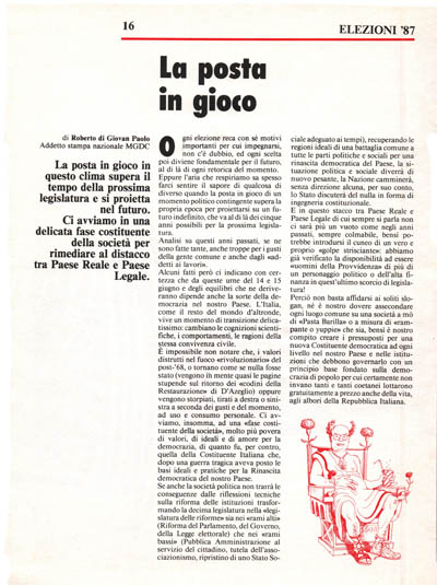 Perciò non basta affidarsi ai soliti slogan, né è nostro dovere assecondare ogni luogo comune su una società a mò di «Pasta Barilla» o a misura di «rampante o yuppie» che sia, bensì è nostro compito creare i pressuposti per una nuova Costituente democratica ad ogni livello nel nostro Paese e nelle istituzioni che debbono governar\o con un principio base fondato sulla democrazia di popolo per cui certamente non invano tanti e tanti coetanei lottarono gratuitamente a prezzo anche della vita, agli albori della Repubblica Italiana.