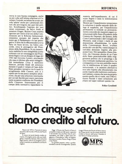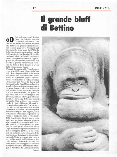 «O Quirinale o morte»! Bettino Craxi da Milano, novello Garibaldi dell'Italia che cambia ha deciso: la Grande Riforma s'ha da fare. Ma quali riforme istituzionali sono in gioco per il Presidente del Consiglio che più a lungo durò? Quella della pubblica amministrazione, quella delle pensioni o quella dei mille e mille ministeri, uffici, enti inutili? No, tutto è molto più «personalizzato» e, aggiungiamo noi, in contraddizione anche con ciò che il gruppo Parlamentare socialista ha fatto e detto durante i lavori della Commissione Bozzi.