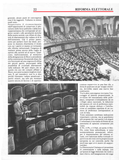 Nel corso dei lavori della commissione ma anche dopo, il senatore Ruffilli, sempre della Dc, ha riassunto in alcuni punti le proposte su cui ritiene, come responsabile Dc per le riforme istituzionali, di trovare credito presso le segreterie degli altri partiti: circoscrizioni elettorali ridotte con 5-1O seggi da assegnare con sistela proporzionale (e con riduzione del numero delle preferenze) e ripartizione dei resti su base regionale; riserva ad un collegio unico nazionale di un decimo dei seggi, da assegnare sulla base di «apparentamenti» dichiarati prima del voto, per il 60 per cento alla coalizione vincente, per il 40 per cento alla coalizione seconda classificata (questo meccanismo non scatterebbe qualora non si costituiscano coalizioni plurapartitiche). Per quanto riguarda l'elezione del Senato, si prevede la riserva di un decimo dei seggi per il collegio unico nazionale, da assegnare con sistema di ripartizione proporzionale.
