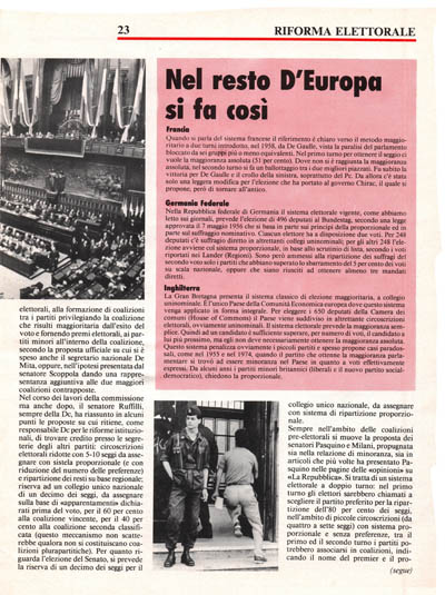 Un terreno ardito, quello della riforma del sistema elettorale, su cui pochi si sono avventurati se si fa eccezione per la proposta di riforma De Gasperi, che fu all'origine della polemica sulla cosiddetta «legge truffa». Ed a questo c'è certo una spiegazione che deriva dalla nostra storia passata e presente. Da un lato il ventennio di dittatura fascista aveva lasciato uno strascico psicologico notevole per cui, per reazione, si è inteso tutelare sin dai primi atti della nostra Repubblica ogni minoranza, di qualunque entità; dall'altro è indubbio che il nostro sistema politico, seppure costantemente viziato da quella che ormai convenzionalmente si definisce