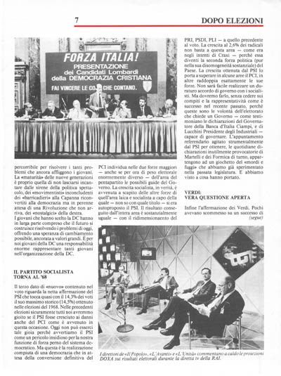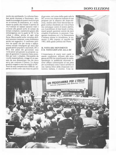 «L'Unità» e Folena (FGCI) per spiegarci che il PCI è il partitq ormai votato solo dagli anziani hanno sostenuto la tesi che i voti giovani alla DC sono voti clientelari e portati da CL. Sulla stessa solfa Notari Stefano («Avanti!»), e altre interpretazioni apparse sugli organi di stampa nazionali (al solito si è distinto il «Corriere della Sera»). Tali tesi possono essere sostenute solo per polemizzare, per nascondere un dato che è omogeneo sull'intero Paese, anche dove CL non c'è, anche dove ci manca il potere per poter fare clientelismo. Tali tesi possono salvare il posto a Folena che dopo aver voluto una FGCI movimentista, autonoma dal PCI, preso sul serio da tanti giovani li ha visti lasciare i comunisti per votare altri partiti. Ma non spiega che il consenso giovanile alla DC nasce dalla sua capacità reale di interpretare meglio di altri partiti i valori in cui le giovani generazioni credono, di aver saputo rispondere alle loro vere aspettative, di aver indicato una strada percorribile per risolvere i tanti problemi che ancora affliggono i giovani. La «maturità» delle nuove generazioni è proprio quella di non lasciarsi incantare dalle sirene della politica spettacolo, dei «movimentisti» inconcludenti dei «barricadieri» alla Capanna riconvertiti alla democrazia ma in perenne attesa di una Rivoluzione che non arriva, dei «nostalgici» della destra.