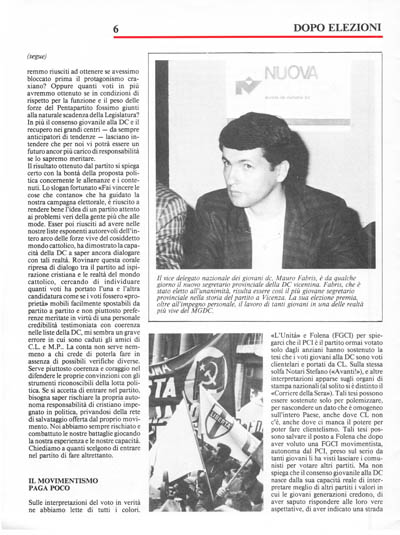 I giovani della DC con la candidatura di numerosi giovani nelle liste del Partito che hanno ottenuto significative affermazioni elettorali, e l'elezione di Renzo Lusetti alla Camera, hanno già dato prova di grande credibilità. Ricostruire il Movimento Giovanile non è stato facile. Vincere le tentazioni di capire le frantumazioni dei «grandi», reprimendo il protagonismo esasperato, è stato un atto di maturità che ci permetterà, con il lavoro di molti, di presentare con serena, seppur contenuta soddisfazione, il nostro lavoro al Congresso del M.G. che speriamo finalmente si possa celebrare ad ottobre come deciso dalla Direzione Nazionale M.G. del 24 Giugno.