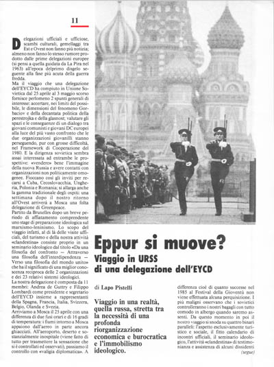 Ma il viaggio che una delegazione dell'EYCD ha compiuto in Unione Sovietica dal 25 aprile al 3 maggio scorso fornisce perlomeno 2 spunti generali di interesse: accertare, nei limiti del possibile, le dimensiçmi del fenomeno Gorbaciov e della decantata politica della perestrojka e della glasnost; valutare gli spazi e le conseguenze di un dialogo tra giovani comunisti e giovani DC europei alla luce del più vasto confronto che le due organizzazioni giovanilli stanno perseguendo, pur con grosse difficoltà, nel Framework di Cooperazione del 1980. E la dirigenza sovietica sembra assai interessata ad entrambe le prospettive: «vendere» bene l'immagine della nuova Russia e avere contatti con organizzazioni non politicamente omogenee. Fioccano così gli inviti per recarsi a Cuba, Cecoslovacchia, Ungheria, Polonia e Romania; si allarga anche la gamma tradizionale degli ospiti: una settimana dopo il nostro ritorno all'Ovest arriverà a Mosca una folta delegazione di Greenpeace.