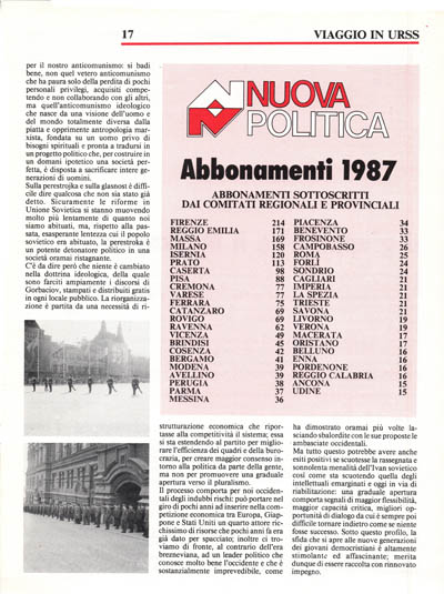 Sulla perestrojka e sulla glasnost è difficile dire qualcosa che non sia stato già detto. Sicuramente le riforme in Unione Sovietica si stanno muovendo molto più lentamente di quanto noi siamo abituati, ma, rispetto alla passata, esasperante lentezza cui il popolo sovietico era abituato, la perestroka è un potente detonatore politico in una società oramai ristagnante.