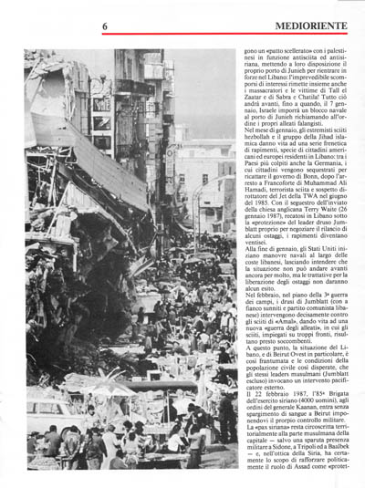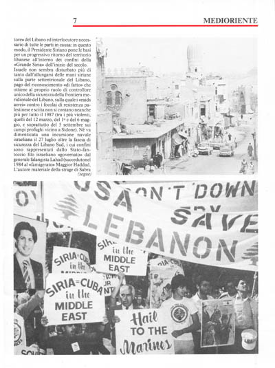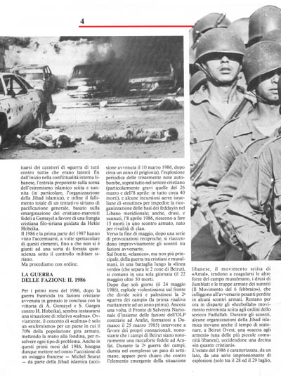 Per i primi mesi del 1986, dopo la guerra fratricida tra fazioni cristiane avvenuta in gennaio (e conclusa con la vittoria di A. Gemayel e S. Gaegea contro H. Hobeika), sembra instaurarsi una situazione di relativa «calma». Ovviamente, il concetto di «calma» è solo un «eufemismo» per un paese in cui il 70% della popolazione gira armato, mettendo la mano alla fondina, per risolvere ogni tipo di problema. Anche in questi primi mesi del 1986, bisogna dunque mettere nel conto l'uccisione di un ostaggio francese – Michel Seurat – da parte della Jihad islamica (uccisione avvenuta il 1O marzo 1986, dopo circa un anno di prigionia), l'esplosione periodica delle tristemente note autobombe, soprattutto nel settore cristiano (particolarmente gravi quelle del 26 marzo e dell'8 aprile: in tutto circa 40 morti), e alcune incursioni aeree israeliane di «routine» per impedire la riorganizzazione delle basi dei feddayin nel Libano meridionale; anche, drusi, e sunnuti, 1'8 aprile 1986, riescono a fare 15 morti in uno scontro armato, nato per rivalità di clan.