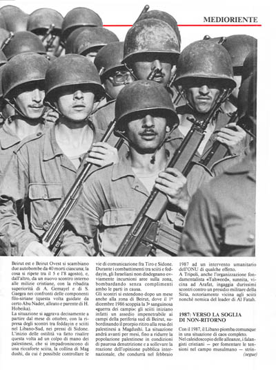 In Libano, il 1985 aveva visto il ritiro dell'esercito israeliano (che vi era entrato nel 1982 per l'operazione «Pace in Galilea»), il riaccendersi della guerra civile per l'occupazione delle posizioni lasciate libere, le definitiva divisione di Beirut in una zona Ovest (musulmana) ed in una zona Est (cristiana), l'accentuarsi dei caratteri di «guerra di tutti contro tutti» che erano latenti fin dall'inizio nella conflittualità interna libanese, l'entrata prepotente sulla scena dell'estremismo islamico sciita e sunnita (in particolare, l'organizzazione della Jihad islamica), e infine il fallimento totale di un tentativo siriano di pacificazione generale, basato sulla emarginazione dei cristiano-maroniti fedeli a Gemayel a favore di una frangia cristiana filo-siriana guidata da Hekie Hobeika.
