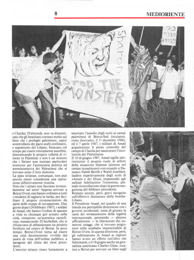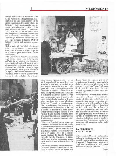 Infine, nella stessa Beirut-Ovest, si nota negli ultimi tempi una certa ripresa dell'attività terroristica, con alcuni attentati nei confronti delle stesse truppe di occupazione siriana ed alcune manifestazioni popolari di scontento, a larga partecipazione, come quella svoltasi il 28 agosto 1987 contro il «carovita».