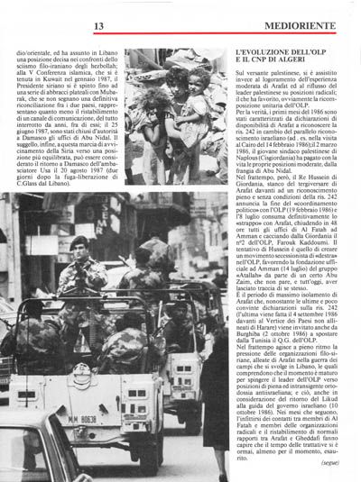 In sintesi, avevamo visto nel 1985 il crearsi di un asse preferenziale tra OLP, Egitto e Giordania, sfociato nell'accordo tra Arafat ed Hussein dell'l 1 febbraio di quell'anno (partecipazione di una delegazione congiunta giordanopalestinese alla convocanda Conferenza Internazionale di pace nel Medio Oriente; creazione di uno Stato palestinese federato con la Giordania in Cisgiordania e a Ghaza; riconoscimento israeliano dell'OLP come interlocutore legittimo nelle trattative); avevamo notato l'atteggiamento negativo di Israele e degli USA di-fronte a tali prospettive, e la contrapposizione ad esse di trattative bilaterali tra Israele e Paesi arabi, e tuttalpiù con una delegazione dei Palestinesi residenti nei territori occupati, purchè non appartenenti o designati dall'OLP; avevamo constatato come l'atteggiamento «trattativista» di Arafat avesse consolidato la spaccatura all'interno del campo palestinese (già nata nel 1983 con la rivolta di Abu Moussa), determinando il sorgere di un Fronte di Salvezza nazionale composto da tutte le fazioni palestinesi filo-siriane. Come cornice, avevamo infine accennato alla frattura esistente all'interno del mondo arabo tra paesi moderati (in primis, l'Egitto, traditore di Camp David; ma anche Giordania, Marocco, Arabia Saudita ed Algeria) e paesi radicali (Siria, Libia ed Iraq).