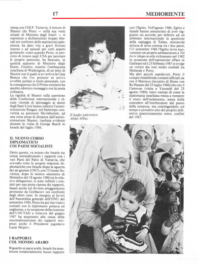 Detto questo, va notato che Israele sta ormai normalizzando i rapporti con i vari Paesi del Patto di Varsavia, che avevano rotto le proprie relazioni diplomatiche con Israele dopo la «guerra dei sei giorni» (1967); con l'Unione Sovietica, dopo lo storico «incontro di Helsinki» del 18 agosto 1986 tra le relative delegazioni, si sono infittiti i contatti per una piena ripresa dei rapporti, basati anche sul diverso atteggiamento promesso da Gorbaciov nei confronti degli ebrei russi. In margine ai lavori dell'Assemblea generale dell'ONU del settembre 1986, Perez ha poi riavviato i contatti con le diplomazie polacca ed ungherese, e in occasione della riunione dell'UNCTAD a Ginevra del giugno 1987 ha acquistato alla causa della «normalizzazione» dei rapporti reciproci anche il Presidente jugoslavo Lazar Mojsov.