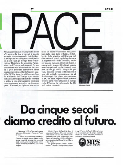 Ora occorre andare avanti perché molto c'è ancora da fare e perché, a questo mondo, nessun traguardo è definitivo. L'Europa ha ora bisogno di unità politica e non è con gli esempi della conservatrice Thatcher e del socialista Papandreu che l'Europa andrà avanti. Per costoro essa è solo un contenitore dal quale si può prelevare liberamente senza mai mettere niente. Da De Gasperi a oggi la DC è la forza che più ha contribuito al rilancio dell'Europa e per questo rimane la forza più affidabile e coerente e unita, la sola che ha saputo costituire un autonomo e autentico partito europeo. L'Europa è per i giovani una necessità e un obiettivo concreto. Sui grandi temi della Pace, dello sviluppo, della libertà, della giustizia dell'Europa può dire molto di più di ogni singolo stato. Il superamento delle frontiere, anche per quanto riguarda i titoli di studio, il mercato del lavoro, il livello di salario, sono bisogni reali per la gioventù europea. Le idee, gli ideali, i bisogni dei giovani, possono trovare soddisfazione in una più solidale cooperazione fra gli Stati europei. Sul piano internazionale la DC ha delle responsabilità primarie proprio per il ruolo che gioca in Europa e che l'Europa ha nel mondo. La DC può e deve onorarle.