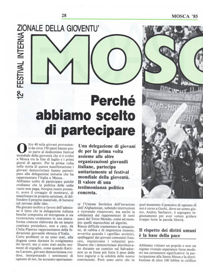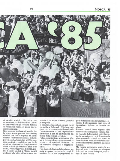 Oltre 40 mila giovani provenienti da circa 150 paesi hanno preso parte al dodicesimo festival mondiale della gioventù che si è svolto a Mosca tra la fine di luglio e i primi giorni di agosto. Per la prima volta nella storia di questa manifestazione i giovani democristiani hanno partecipato alla delegazione unitaria che ha rappresentato l'Italia a Mosca.