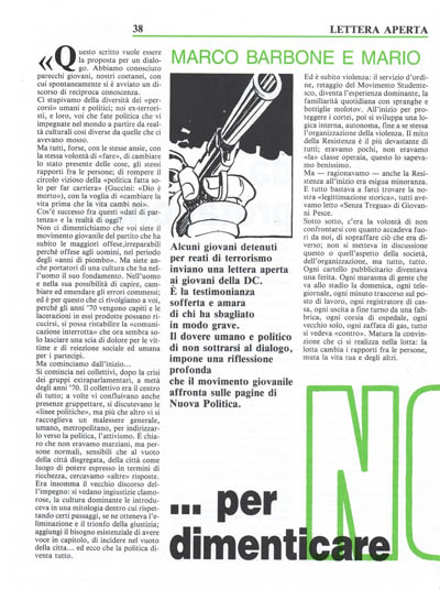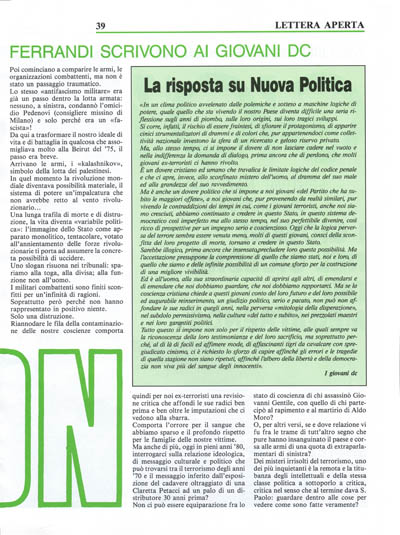 Non ci dimentichiamo che voi siete il movimento giovanile del partito che ha subito le maggiori offese,irreparabili perché offese agli uomini, nel periodo degli «anni di piombo». Ma siete anche portatori di una cultura che ha nell'uomo il suo fondamento. Nell'uomo e nella sua possibilità di capire, cambiare ed emendare gli errori commessi; ed è per questo che ci rivolgiamo a voi, perché gli anni '70 vengono capiti e le lacerazioni in essi prodotte possano ricucirsi, si possa ristabilire la «comunicazione interrotta» che ora sembra solo lasciare una scia di dolore per le vittime e di reiezione sociale ed umana per i partecipi.