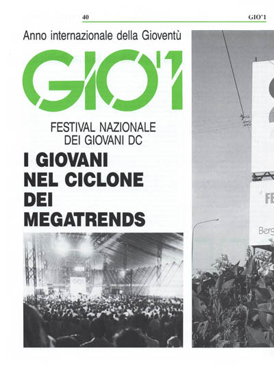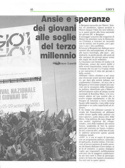 E dobbiamo farlo nello stile che da due anni circa stiamo mettendo nella ormai rituale iniziativa nazionale, con l'intenzione di utilizzare la festa dei Giovani dc come luogo di formazione politica seria, duratura negli effetti, che poco lascia all'effetto «presenza per la presenza».