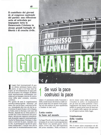 ritiene che il problema della Pace e della solidarietà tra i popoli sia, alle soglie del terzo millennio, parte fondamentale di un programma politico su cui costruire la proposta politica di un partito laico di ispirazione cristiana che vuole concorrere a guidare il processo di cambiamento del nostro Paese. Pertanto la Democrazia Cristiana, nel pieno rispetto dei suoi principi e della sua ispirazione cristiana si impegna a proporre l'approvazione, entro il 1986,