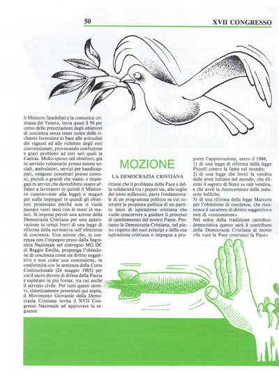 L'obiezione di coscienza, aumentata nel numero in questi ultimi anni (sono oltre 10 mila gli obiettori nel 1986), è lo specchio di una generazione di giovani che, nel rispétto della legge, ed anzi lottando per leggi più giuste, intendono pagare di persona esponendosi ad un servizio civile più lungo di ben otto mesi di quello militare; esponendosi' ad una attesa che, per i ritardi talvolta voluti del Ministero della Difesa, arrivano anche a 10 mesi per la prima approvazione delle motivazioni e toccano anche i 12 mesi per la precettazione. Da qualche tempo poi il Ministero della Difesa, specie dopo la polemica tra il Ministro Spadolini e la comunità cristiana del Veneto, invia quasi il 50 per cento delle precettazioni degli obiettori di coscienza senza tener conto delle richieste formulate in base alle attitudini dei ragazzi ed alle richieste degli enti convenzionati, provocando confusione e gravi problemi ad enti seri quali la Caritas. Molto spesso tali obiettori, già in servizio volontario presso mense sociali, ambulatori, servizi per handicappati, vengono precettati presso comuni, piccoli o grandi che siano, e impiegati in servizi che dovrebbero essere affidati a lavoratori (e quindi il Ministero cqntravviene alla legge) _omagari per nulla impiegati (e quindi gli obiettori protestano perché non si vuole passare venti mesi con le mani in mano). Si impone perciò una azione della Democrazia Cristiana per una approvazione in tempi brevi di una legge di riforma della normativa sull'obiezione di coscienza. Una azione che, in coerenza con l'impegno preso dalla Segreteria Nazionale nel convegno MG DC di Reggio Emilia, proponga l'obiezione di coscienza come un diritto soggettivo e non come una concessione, in conformità con la sentenza della Corte Costituzionale (24 maggio 1985) per cui il sacro dovere di difesa della Patria è espletato in più forme, tra cui anche il servizio civile. Per tutti questi moti vi, sinteticamente presentati qui sopra, il Movimento Giovanile della Democrazia Cristiana invita il XVII Congresso Nazionale ad approvare la seguente