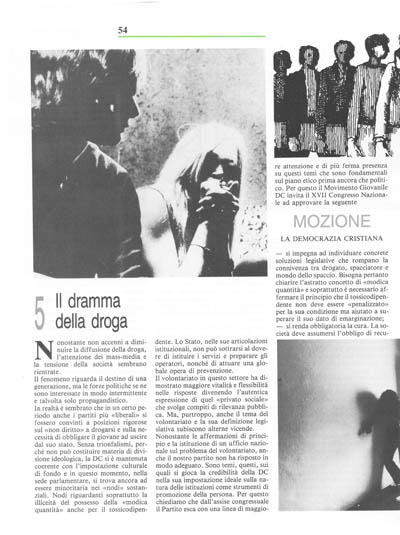 Nonostante le affermazioni di principio e la istituzione di un ufficio nazionale sul problema del volontariato, anche il nostro partito non ha risposto in modo adeguato. Sono temi, questi, sui quali si gioca la credibilità della DC nella sua impostazione ideale sulla natura delle istituzioni come strumenti di promozione della persona. Per questo chiediamo che dall'assise congressuale il Partito esca con una linea di maggiore attenzione e di più ferma presenza su questi temi che sono fondamentali sul piano etico prima ancora che politico. Per questo il Movimento Giovanile DC invita il XVII Congresso Nazionale ad approvare la seguente