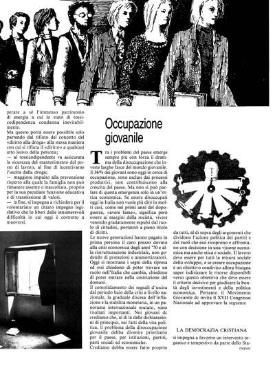 Il consolidamento dei segnali d'uscita dal periodo buio della crisi a livello nazionale, la graduale discesa dell'inflazione e la stabilità monetaria, in un panorama internazionale mutato, sono risultati importanti. Noi giovani dc crediamo che, al di là delle dichiarazioni di principio, nei fatti della vita politica, il problema della disoccupazione giovanile debba divenire prioritario per il paese, per istituzioni, partiti, parti sociali ed economiche.
