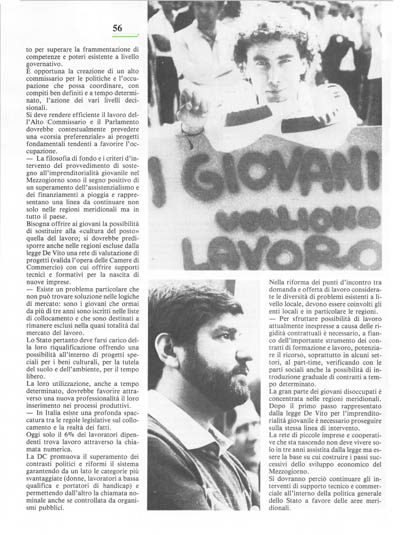 Bisogna offrire ai giovani la possibilità di sostituire alla «cultura del posto» quella del lavoro; si dovrebbe predisporre anche nelle regioni escluse dalla legge De Vito una rete di valutazione di progetti (valida l'opera delle Camere di Commercio) con cui offrire supporti tecnici e formativi per la nascita di nuove imprese.